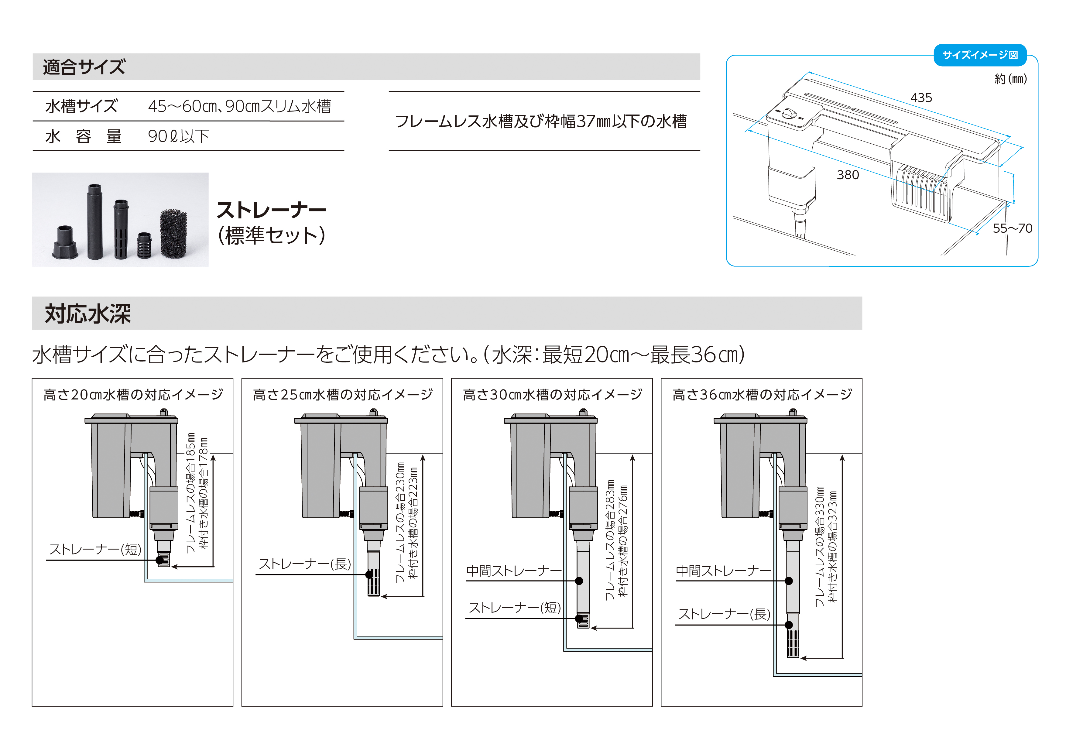 ・水槽サイズに合ったストレーナーを使用する事で対応水深4パターンまで対応(水深:最短20㎝から最長36㎝まで)
